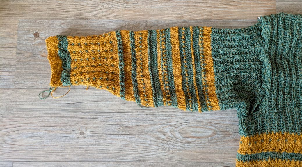 Das ist noch ausbaufähig. Zuerst muss ich den zweiten Ärmel stricken, anders als in der Vorlage wird er aber gleich. Verschiedene Muster an zwei Armen – das würde mich wohl überfordern.