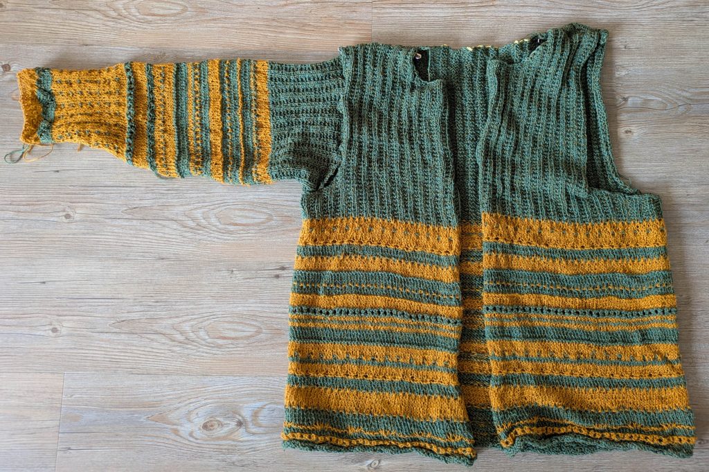 Anschließend werde ich die Teile spannen müssen, das ist bei eingestrickten Mustern leider erforderlich. Danach werde ich sie zusammennähen, bevor es an die Fertigstellung mit Blenden und Knöpfen geht. Letztere muss ich überhaupt erstmal kaufen.
