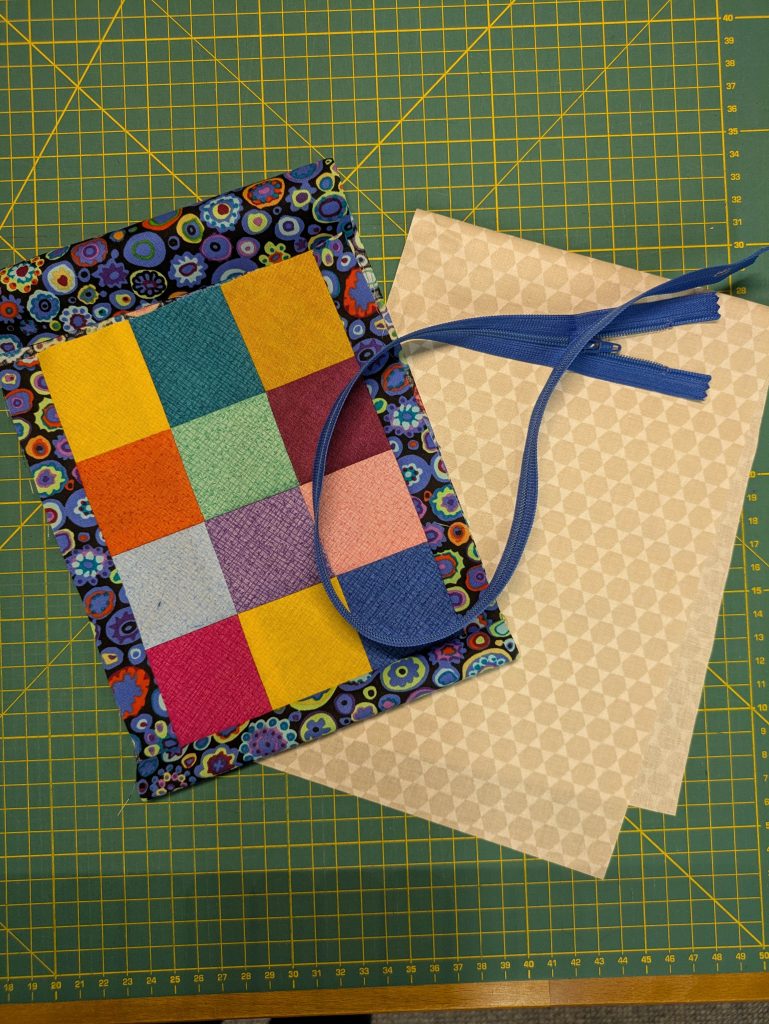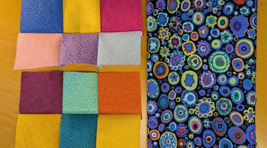 Im Beitragsbild sind die beim zweiten Schneiden entstandenen Quadrate schon auf dem Weg zu einer neuen Einheit, die das Motiv für die Vorderseite werden soll. Daneben liegt der bunte Stoff, den ich als Ergänzung vorne und für die Rückseite benötige.